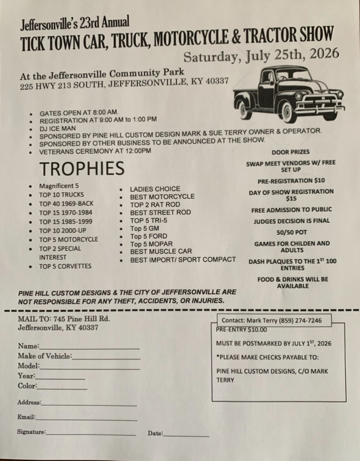JULY-25-TICK-TOWN CAR SHOW 225 HWY. 213 S. @ COMMUNITY PARK JEFFERSONVILLE KY. 8AM-3PM