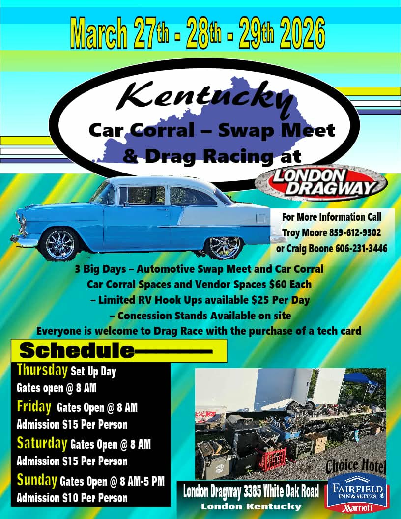 MARCH-27-28-29- KENTUCKY CAR CORRAL- SWAP MEET & DRAG RACING AT LONDON DRAGWAY, 3385 WHITE OAK ROAD, LONDON, KY 8AM-5PM DAILY (TEST & TUNE DRAG RACING) FOR MORE INFORMATION CONTACT TROY MOORE AT (859) 612-9302 (FLYER)