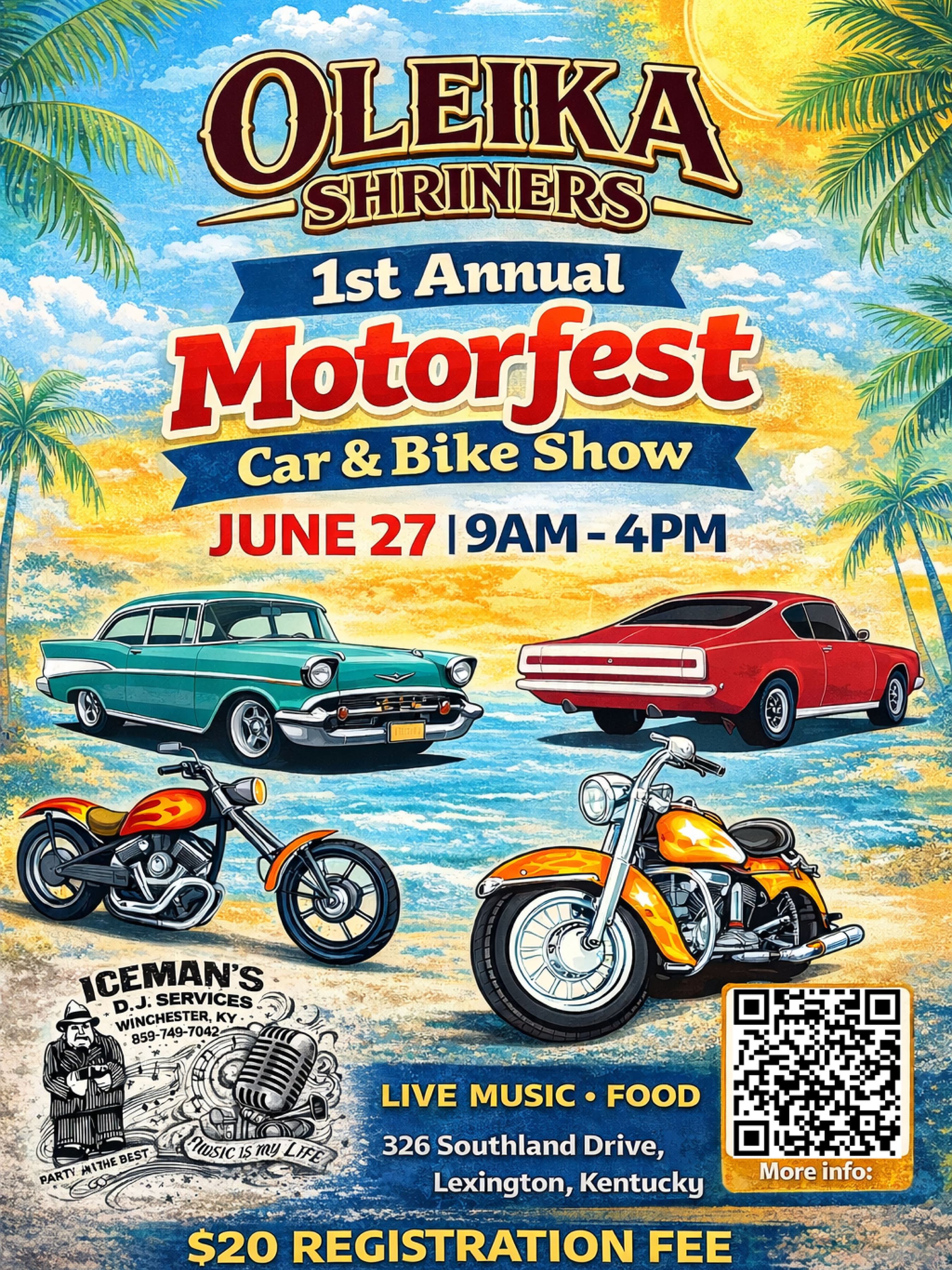 JUNE-27- OLEIKA SHRINERS 1ST ANNUAL MOTORFEST CAR & BIKE SHOW, 326 SOUTHLAND DRIVE, LEXINGTON, KY 9AM-4PM (FLYER)