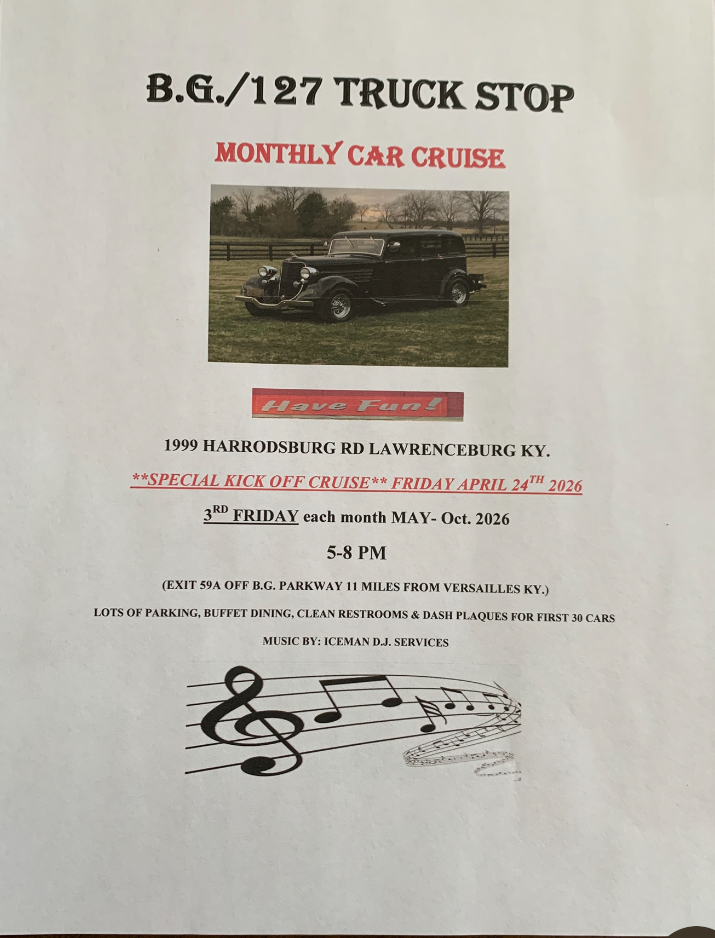 JUNE-19-(FRIDAY)- B/G 127 TRUCK STOP, 1999 HARRODSBURG RD, LAWRENCEBURG, KY @ EXIT 59A ON BLUEGRASS PARKWAY 5PM-8PM (FLYER)